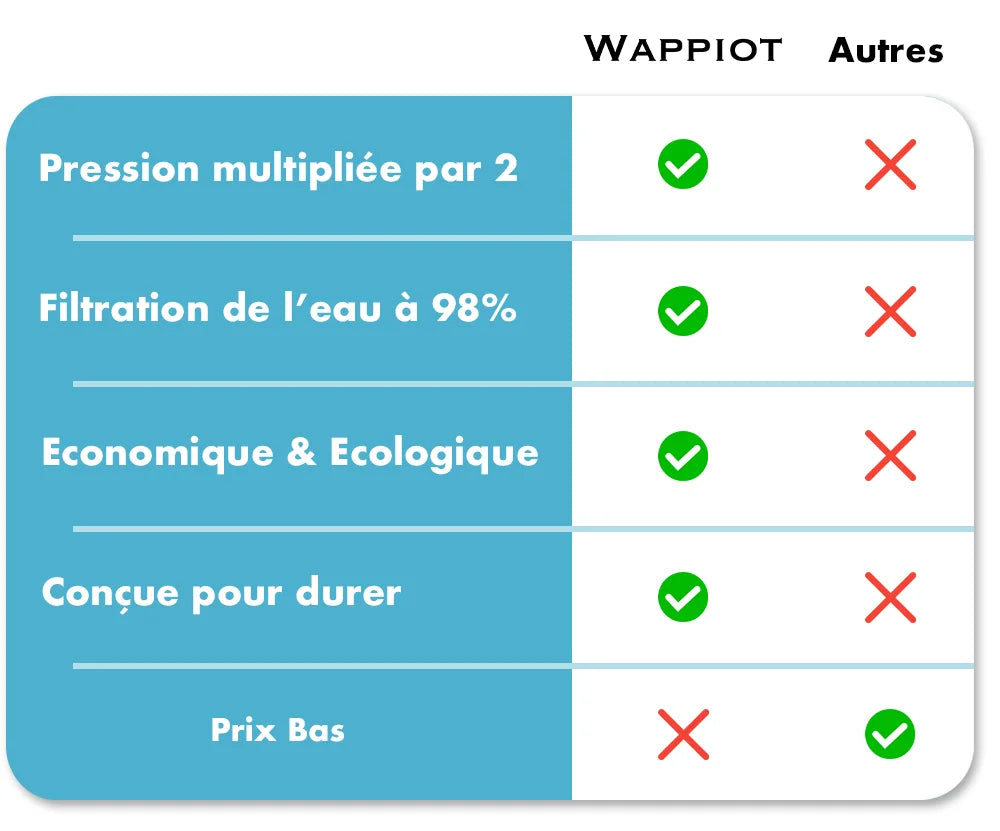 ✅ Les filtres en coton recyclés Wappiot™ améliorent le PH et filtrent 98% des impuretés, des saletés et du calcaire.